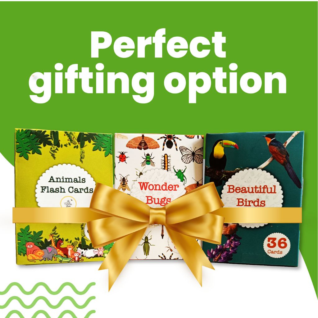 Empower your child's curiosity and inspire screen-free childhoods with Nature's Combo Flash Cards from The Curious Bees. This set of three flashcard sets includes Animals, Birds, and Wonder Bugs, designed to provide endless learning and fun for children aged 24 months to 8 years.