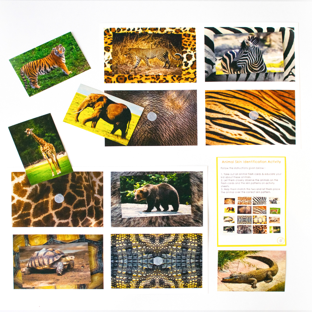 2 worksheets showcasing unique animal skin patterns, paired with animal flashcards, challenge kids to identify and match the patterns, enhancing their observation skills.