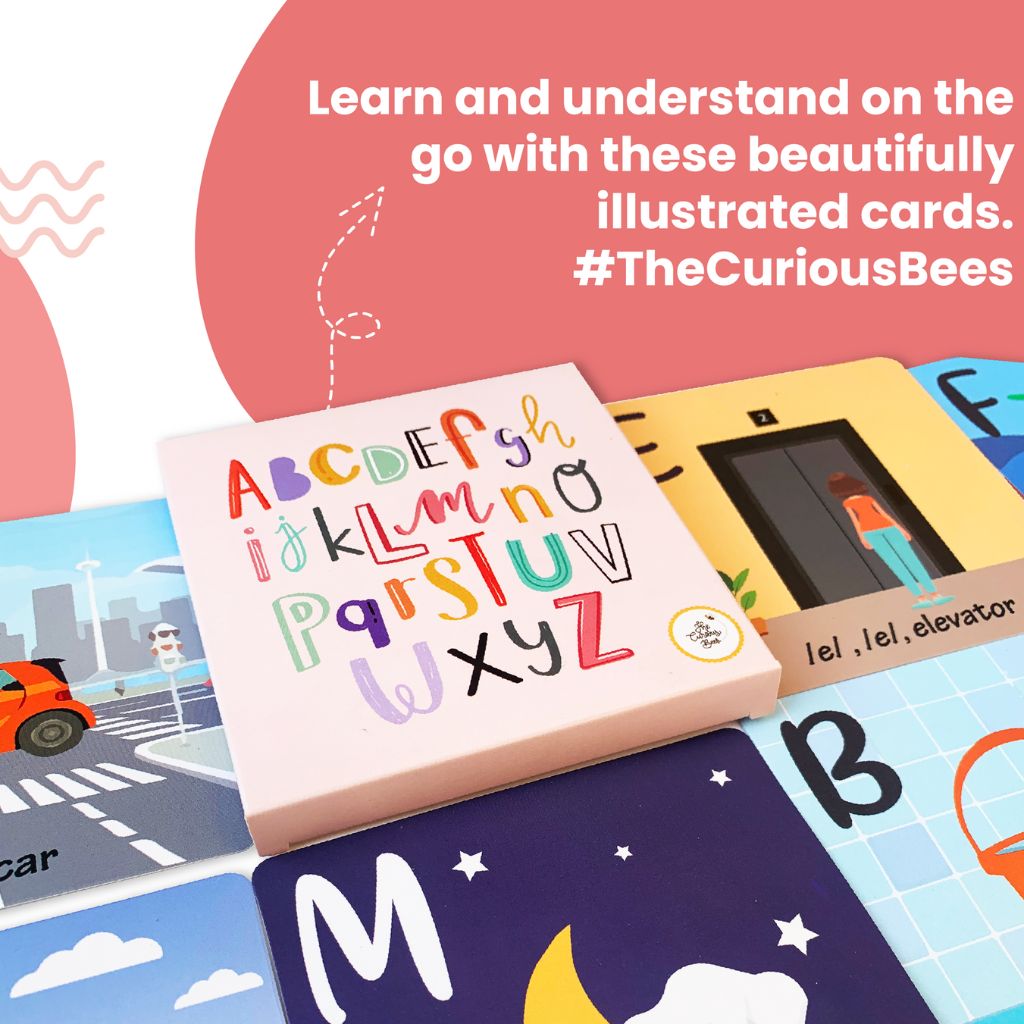 Alphabet Flashcard Set: Engage your kids with 26 beautifully illustrated cards featuring both capital and small English letters. Each card showcases an adorable picture, creating a strong association with the letters. These cards are the ideal learning companions, fostering phonics skills, language development, and early speech proficiency.
