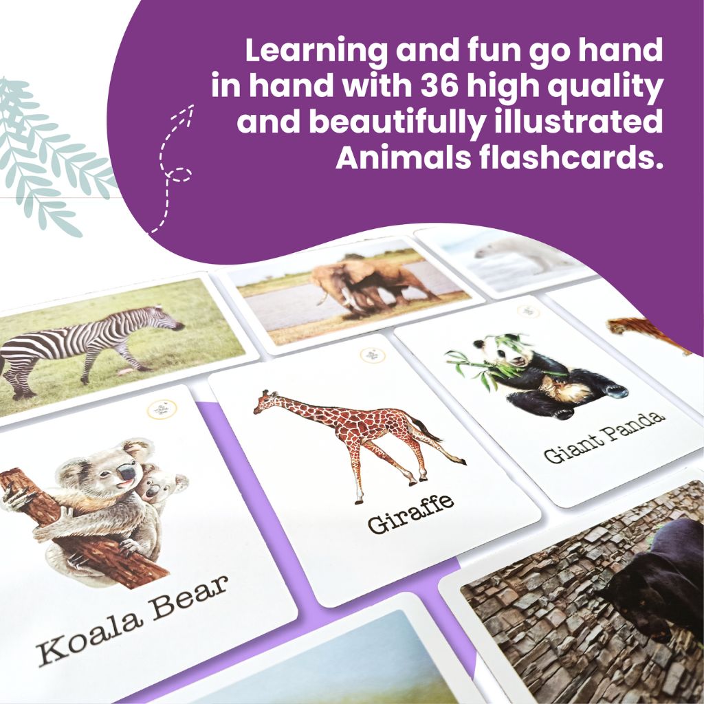 Animals Flashcard Set: Learning becomes a delightful adventure with these 36 high-quality, beautifully illustrated animals flashcards. Each card features an amazing illustration of the animal on one side, and on the other side, a high-quality image showcasing the animal in its natural habitat. These cards create an engaging learning experience, fostering curiosity about the incredible creatures that share our planet.