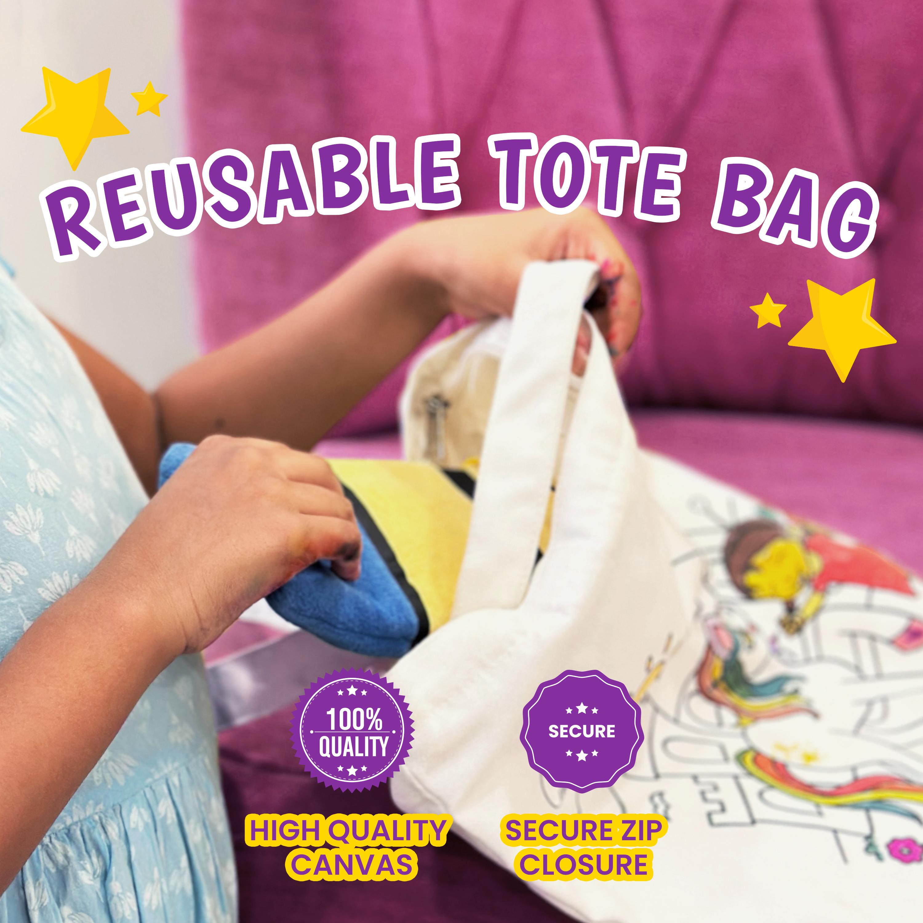 1. Tote Bag Colouring: Let your child’s artistic flair shine with our reusable tote bag. Made from high-quality canvas and a secure zip, this tote can be coloured and re-coloured after washing, offering endless possibilities.